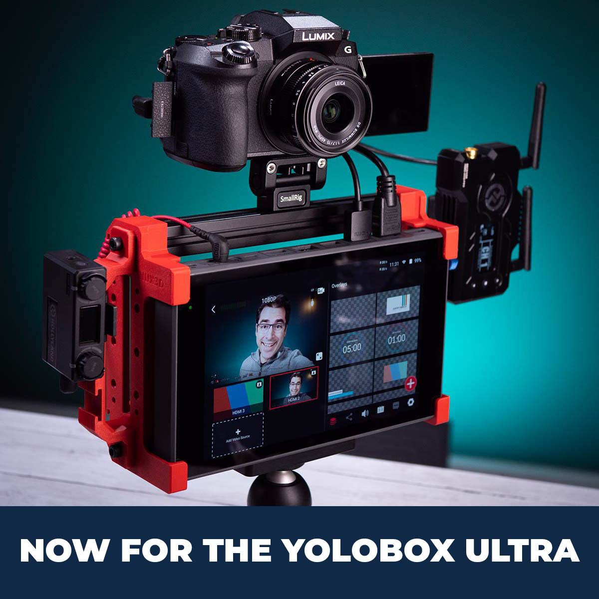 By simply extending the built in legs, the tripod mountable cage for the YoloBox Ultra is now a rigid desktop stand.